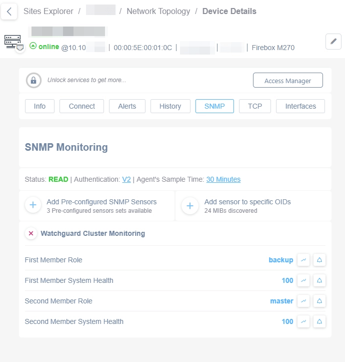 Domotz has built ready-to-use SNMP templates for WatchGuard firewalls. You can use them to optimize the management of multiple networks. In addition, you can use Domotz to analyze changes in the metrics you track over time and visualize their metrics in dashboards.